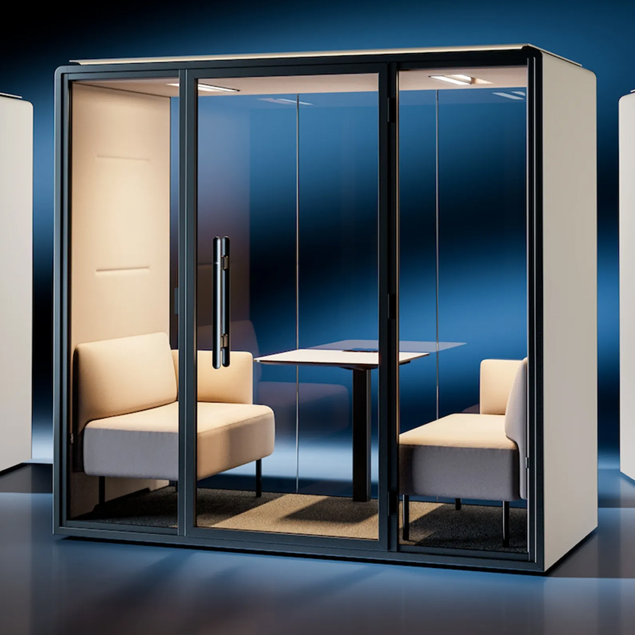 • A modern, soundproof pod for 1-4 people featuring customizable interiors, ergonomic sofas, and flexible table setups. Out of Stock