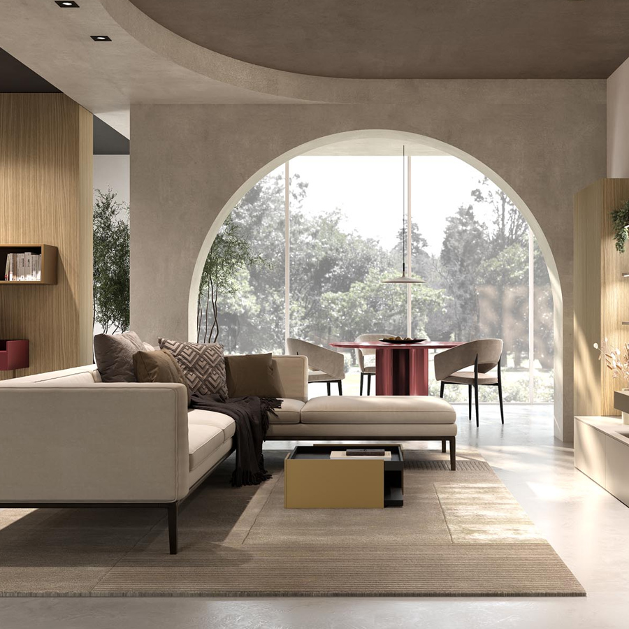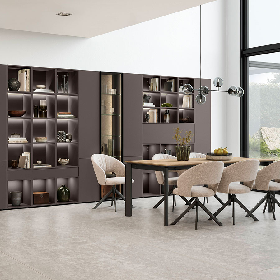 Simply arrive and switch off: Inspired by natural earth tones, the combination of light macchiato and textured coffee-colored surfaces creates an ambience with a special charm. The wall-mounted Ambia display cabinets are an elegant addition to the asymmetrically designed lowboard including spacious nBOX drawers. The coffee table blends elegantly into the color concept – ideal for a home with expression and class. -