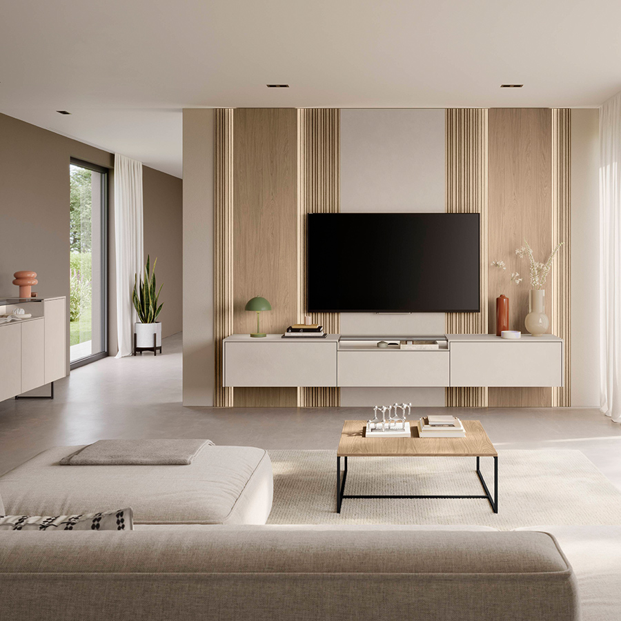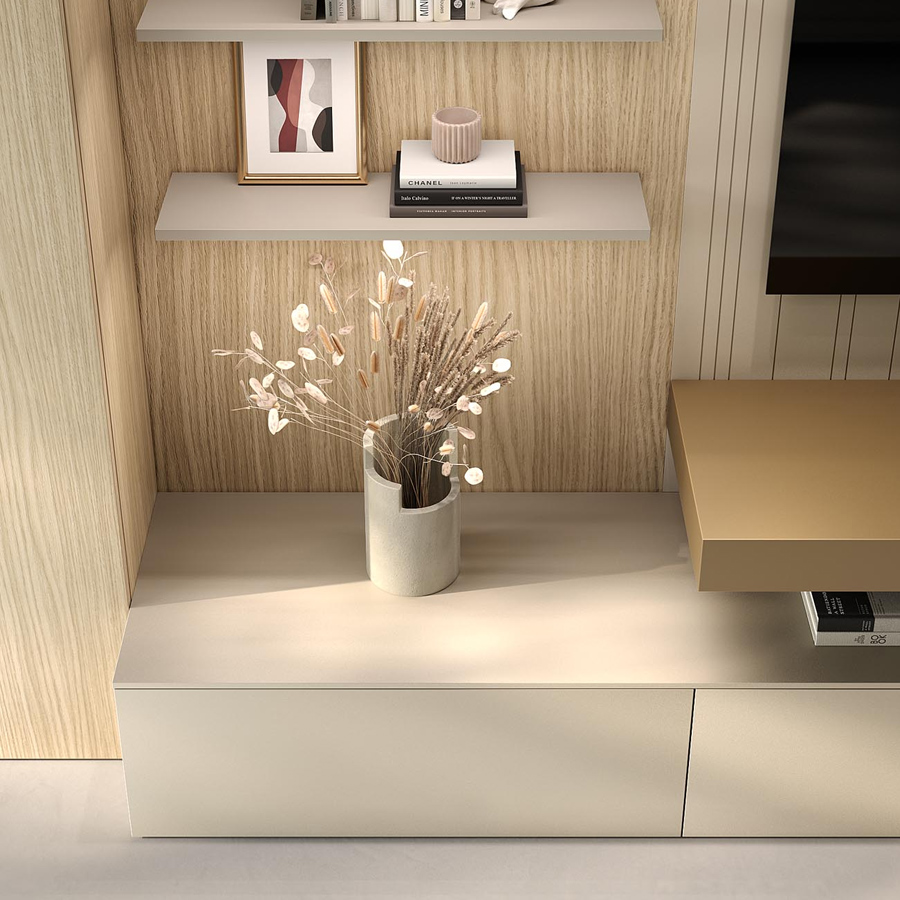 Puristic and stylish! This living solution impresses with its clear design language and harmonious material combinations. Generous, handleless fronts create a calm overall look, while the open shelves stand for lightness and room for decoration. The warm wood tone of the console plate sets a natural accent and brings lively contrasts into play. A design that creates order and at the same time offers a modern eye-catcher. -