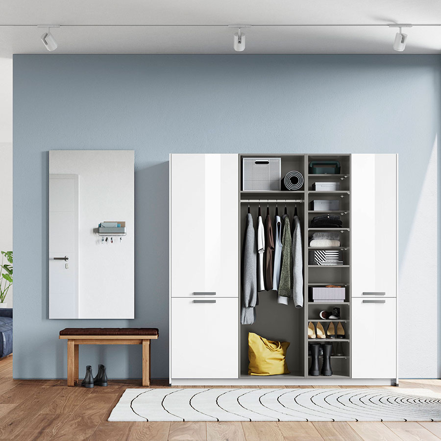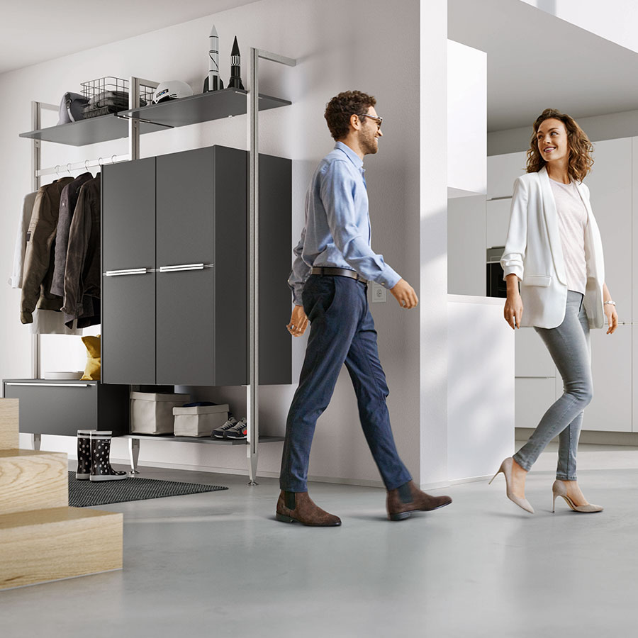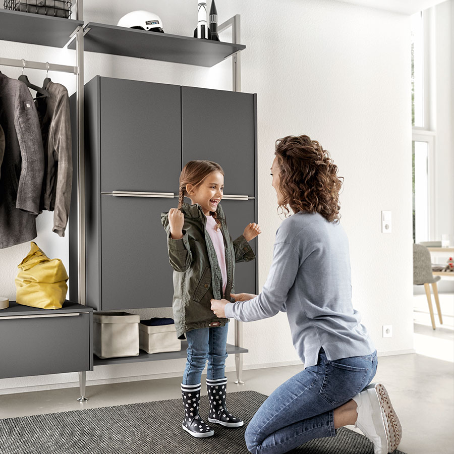 With fronts and carcase in slate grey supermatt, this piece of furniture radiates timeless elegance and adapts to any room situation in a versatile way. The shelving system offers maximum variability: it can be extended as required and can be customized with cupboards, pull-outs, shelves and clothes rails. This transforms any hallway into a real space miracle. -