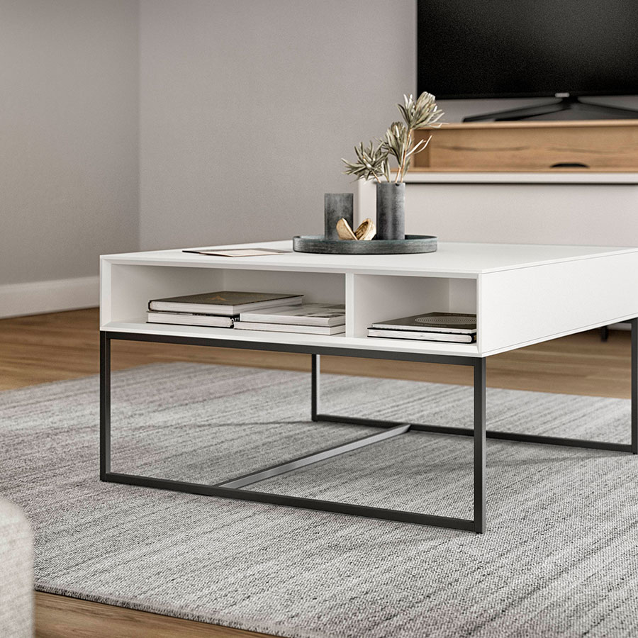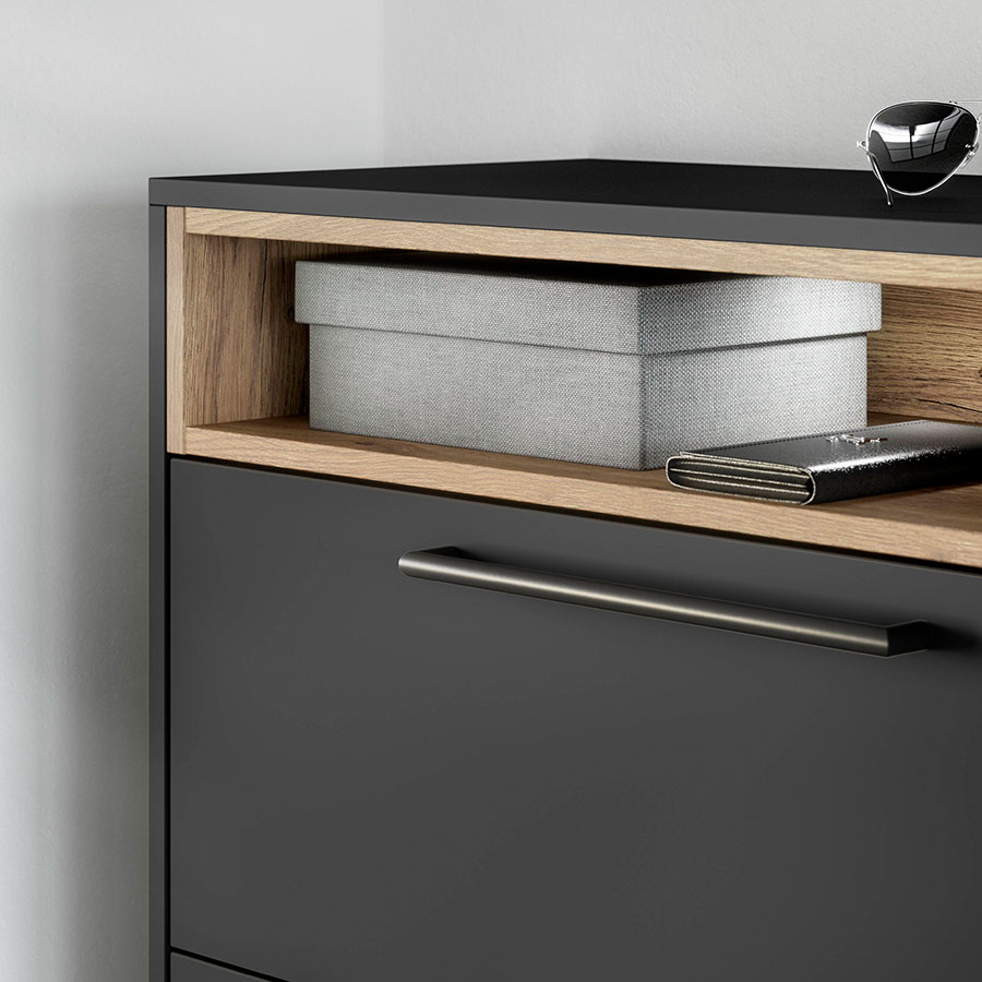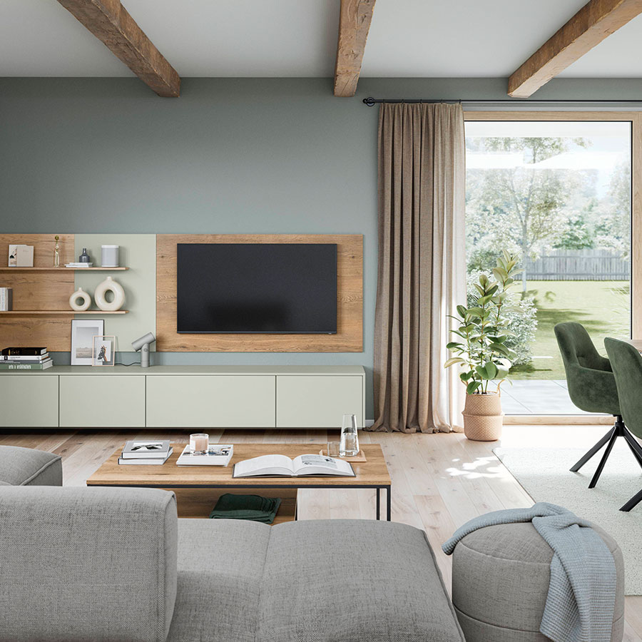 Simply arrive and switch off: Inspired by natural earth tones, the combination of light macchiato and textured coffee-colored surfaces creates an ambience with a special charm. The wall-mounted Ambia display cabinets are an elegant addition to the asymmetrically designed lowboard including spacious nBOX drawers. The coffee table blends elegantly into the color concept – ideal for a home with expression and class.