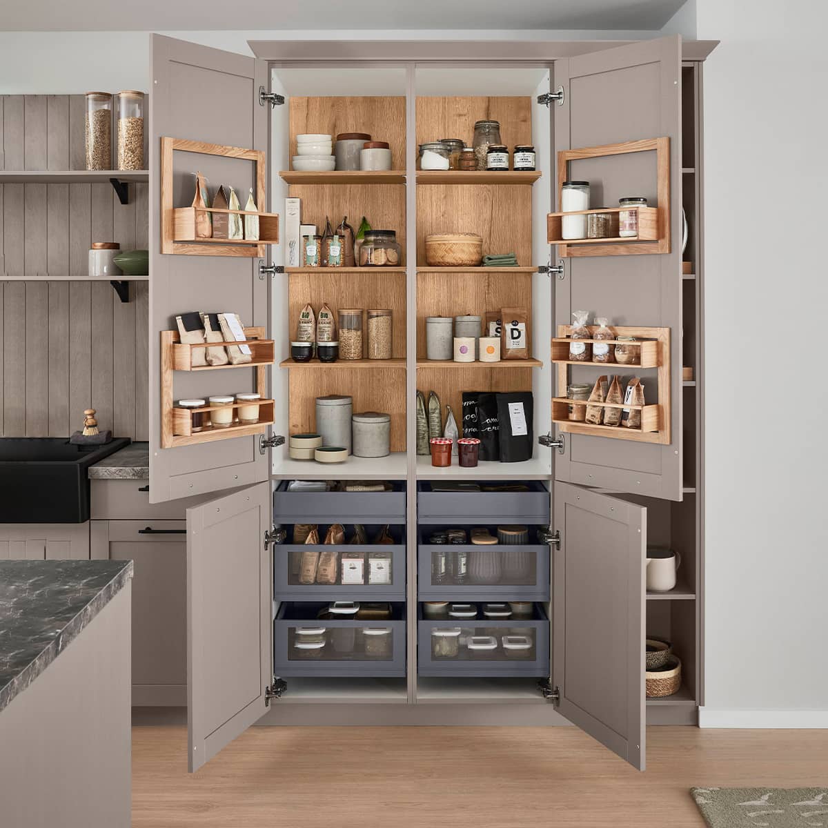 The colour palette includes four distinctive tones. Frame 613 presents a white wood texture that feels timeless and elegant and brings clarity to both small and large spaces. Frame 617 comes in an olive wood texture with an anti-fingerprint surface that keeps the kitchen looking clean while adding a stylish natural touch. Frame 614 showcases stone blue which refreshes the traditional country house aesthetic with a calm yet expressive look. Frame 619 in macchiato delivers a warm and inviting atmosphere that enhances comfort and character.