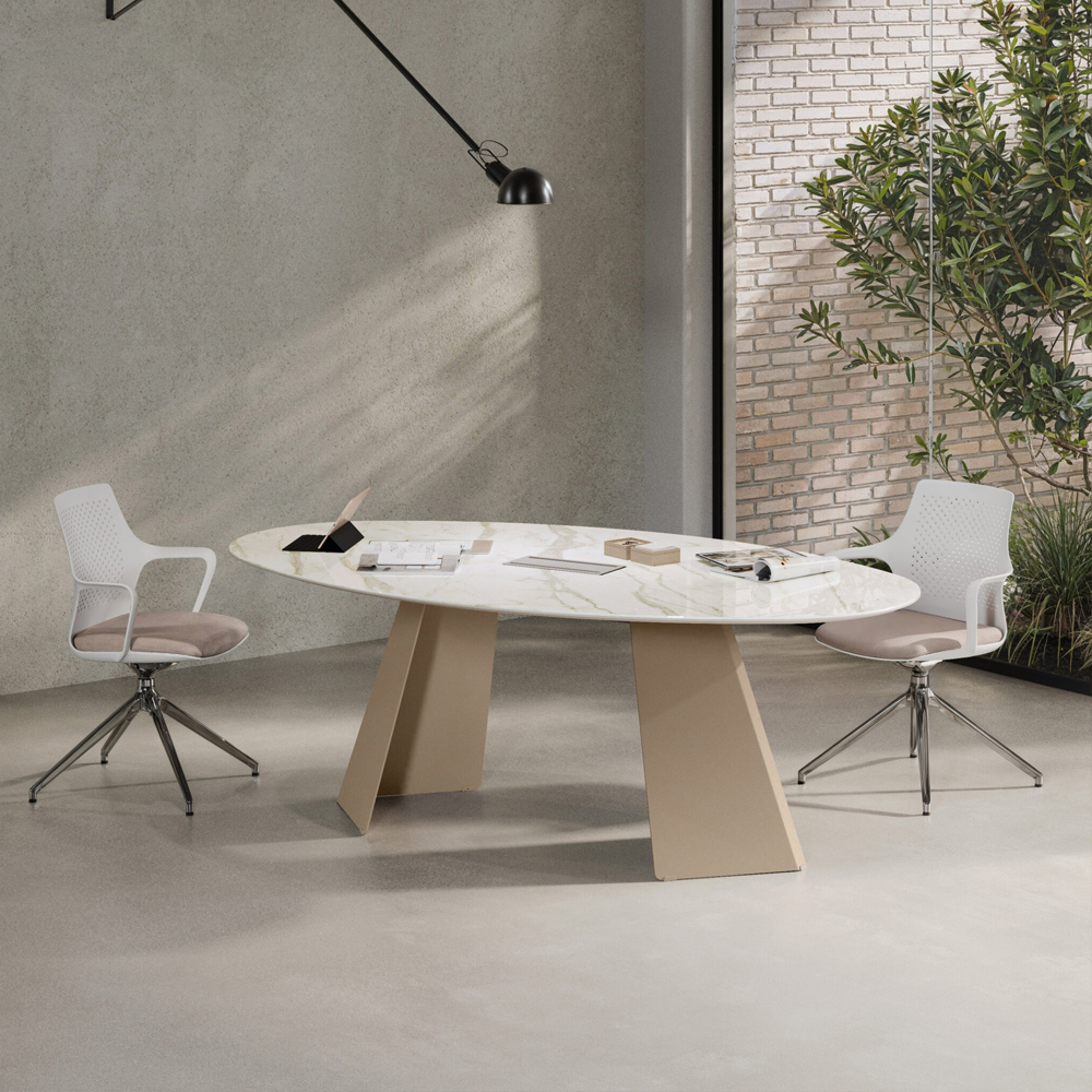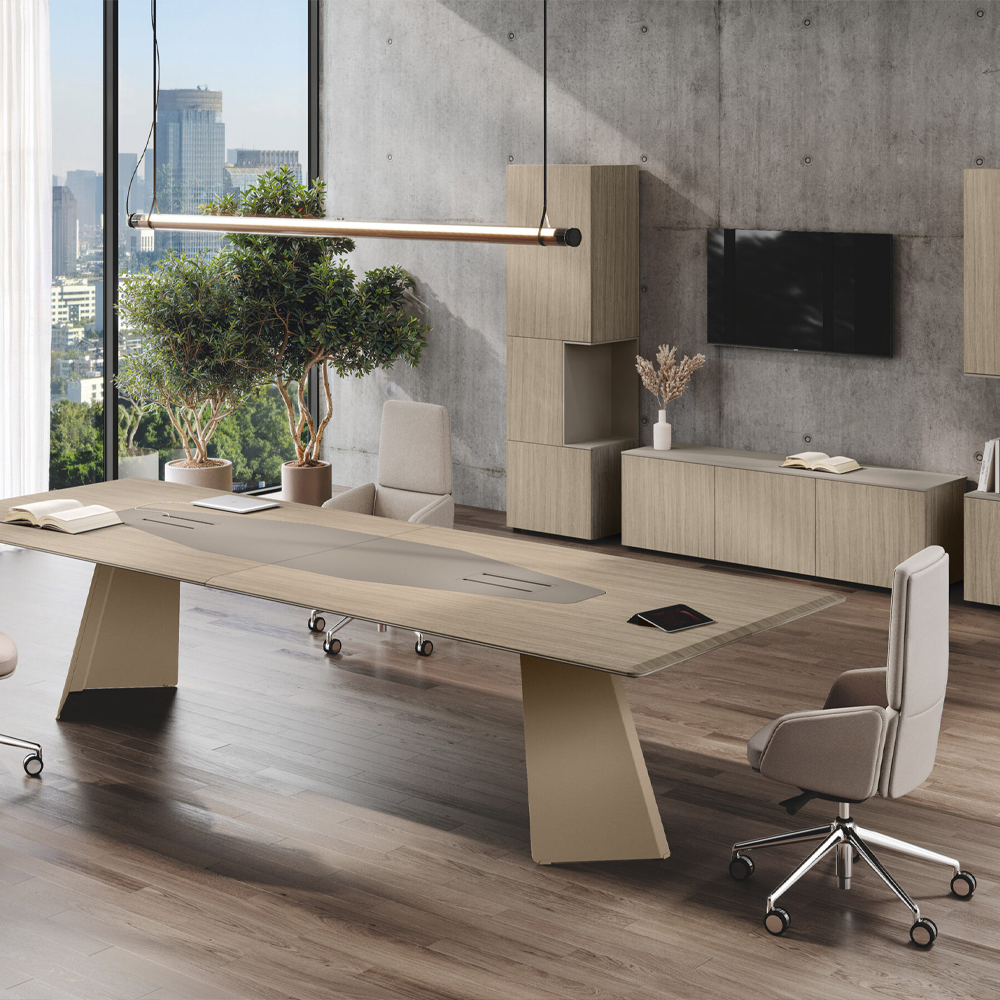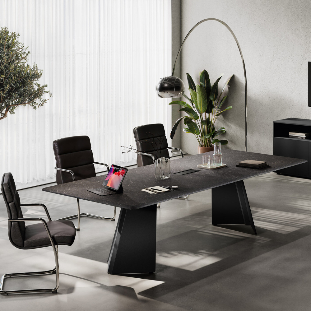 The Monolith Meeting Table combines sculptural elegance with modern design, featuring a distinctive metal base for executive and refined meeting spaces.