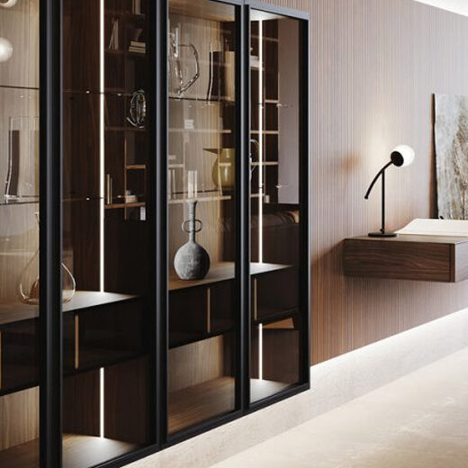 Walnut wood bookcase with storage units. Boiserie in striped Walnut wood with desk in the same finish and top in eco-leather, NAKED display cabinet with doors in black aluminum and smoked glass. ALFIE coffee table with walnut wood top and dividers.