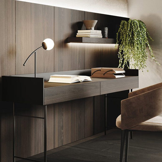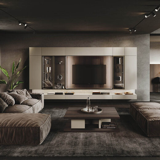 An outstanding design element in the living room is the shimmering metallic connection between the bronze-coloured rear wall and the stylish Smartcube shelves. This sophisticated detail sets refined accents and gives the room a unique, elegant atmosphere.