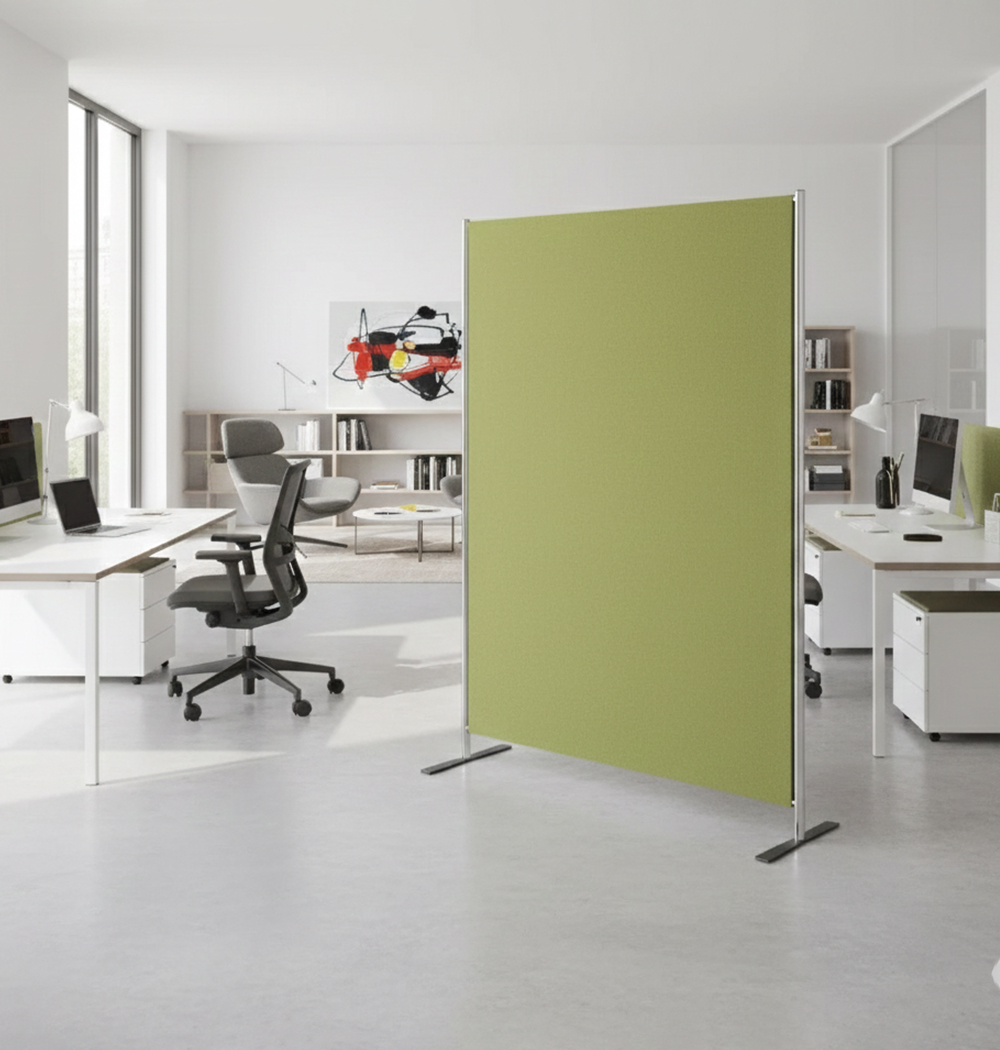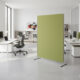 The removable “Snowsound Fiber 3 Melange” polyester fabric is fire-resistant, Greenguard Gold certified for low VOC emissions, 100% recyclable, and free from formaldehyde. The structure includes chromed steel uprights and crossbars, with sturdy bases attached by screws.