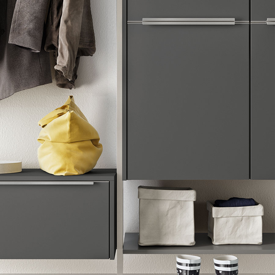 With fronts and carcase in slate grey supermatt, this piece of furniture radiates timeless elegance and adapts to any room situation in a versatile way. The shelving system offers maximum variability: it can be extended as required and can be customized with cupboards, pull-outs, shelves and clothes rails. This transforms any hallway into a real space miracle.