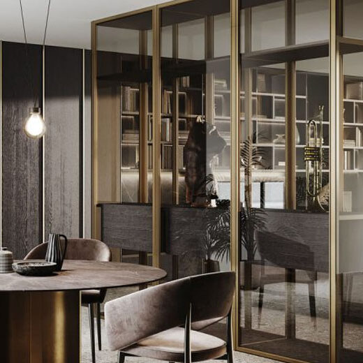 House of Contrabass is a design concept where modular living wall systems blend elegant finishes with functional elements. Featuring boiserie, lacquered cabinets, wood library units with aluminium and glass doors, and LED-accented structures, it channels jazz-like creativity and rhythm in sophisticated interiors.