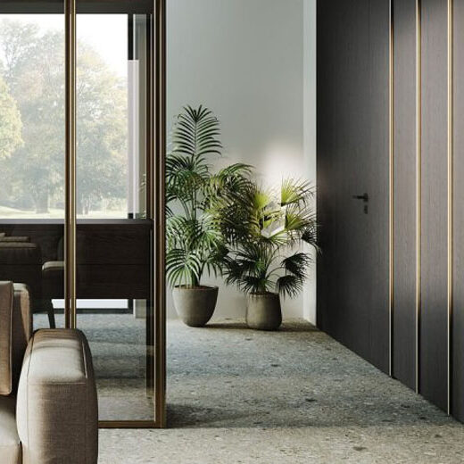 MISTY bookcase in BL ash wood with brass inserts, storage units in GR Pietra bi-laminate, followed by Flat wardrobe with bronze handle and ESP Core hinged door.